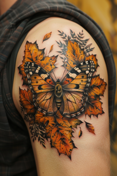 This upper arm tattoo showcases a striking butterfly nestled among richly colored autumn leaves. The butterfly s wings are detailed with warm tones of orange, gold, and brown, perfectly echoing the seasonal colors of the surrounding leaves. The realistic shading brings both the butterfly and the leaves to life, giving the tattoo a dynamic feel that seems to pop off the skin. The design flows naturally with the arm s shape, making it an ideal piece for the upper arm or shoulder.