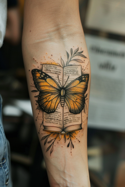 This stunning forearm tattoo features a vibrant yellow butterfly hovering over an open book, with text flowing across the pages. The butterfly s wings are intricately shaded with rich golden hues, beautifully contrasting against the delicate details of the book. Small leaves and dot accents add a nature-inspired touch, making the whole design feel like a celebration of knowledge and transformation. The placement on the forearm allows the tattoo to be a visible reminder of the power of stories and personal growth.