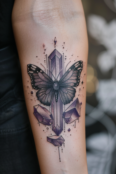 This eye-catching tattoo features a delicate butterfly at the center, surrounded by sharp, geometric crystals. The butterfly s wings are shaded in soft black and grey, creating a beautiful contrast with the purple-toned crystals that seem to rise out of the ground. The symmetrical design is balanced, with the crystals adding an edge of mystery and strength to the elegance of the butterfly. Tiny stars and dots scattered around the design enhance the ethereal, almost magical feel of the tattoo. Placed on the forearm, the combination of organic and geometric elements makes this piece both striking and unique.