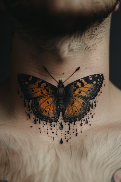 This bold and striking neck tattoo features a large butterfly with beautifully detailed wings in shades of deep orange and black. What makes this tattoo truly unique is the dripping ink effect beneath the butterfly, as though the ink is melting or running down the neck. The dots and drips give the design an edgy, almost surreal vibe, adding to the intensity of the butterfly s vibrant colors. Positioned at the center of the throat, this piece commands attention and makes a powerful statement.