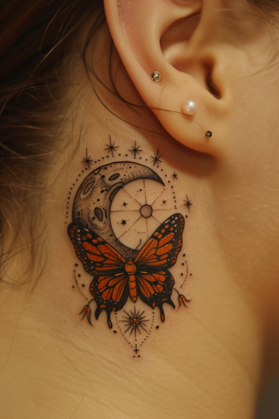 I think this tattoo is absolutely mesmerizing. The combination of a butterfly often representing transformation and the crescent moon, which symbolizes growth and change, makes it feel super meaningful. I love how the colors and elements contrast but also complement each other, creating a perfect balance between nature and the cosmos. It s the kind of tattoo that feels like a gentle reminder of life s constant changes, and I m here for it! Plus, it s placed right behind the ear, adding a bit of mystery and subtlety to the whole vibe.