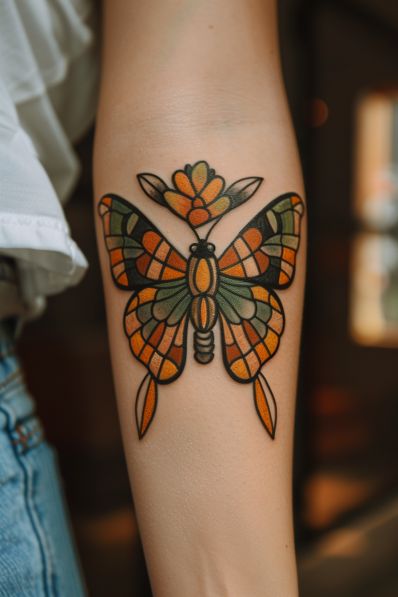 This eye-catching forearm tattoo is inspired by stained glass art, with its bold black outlines and vibrant shades of orange, green, and yellow. The butterfly s wings are segmented into geometric shapes, giving the illusion of colored glass catching the light. Above the butterfly, a small flower is rendered in the same style, tying the whole piece together beautifully. The combination of strong lines and rich colors makes this tattoo feel like a piece of living art, perfect for anyone who loves creative, bold designs.