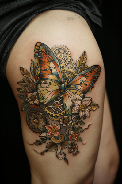 This incredible tattoo blends the beauty of a butterfly with steampunk-inspired elements like gears, cogs, and mechanical details. The butterfly s wings are highlighted in shades of orange and blue, giving it a vibrant and lively look, while the surrounding gears and flowers create an industrial-meets-nature vibe. The intricate shading and linework on the gears make them look almost three-dimensional, adding depth to the design. Placed on the thigh, this large and detailed tattoo makes a bold and artistic statement.