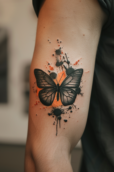 This edgy arm tattoo combines a black and grey butterfly with vibrant watercolor splashes of orange and black ink. The butterfly itself is detailed with subtle shading and fine lines, while the surrounding splatters add a burst of energy to the design. The contrast between the soft, lifelike butterfly and the chaotic ink splashes creates a dynamic and artistic vibe, making this tattoo stand out as a bold statement piece. Placed on the upper arm, it s the perfect blend of edgy and artistic.