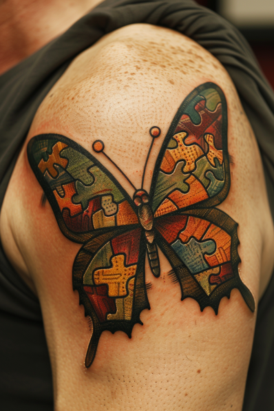 This unique tattoo features a butterfly whose wings are filled with colorful puzzle pieces. The puzzle pieces come in various shades of red, orange, green, and blue, creating a vibrant and eye-catching design. The butterfly itself has bold black outlines that give the tattoo a strong presence on the shoulder, while the puzzle pieces inside symbolize complexity, connection, and the idea that every piece has a place. The intricate shading and 3D effect make it look as though the puzzle pieces are actually part of the butterfly s structure, giving the tattoo an added layer of depth.