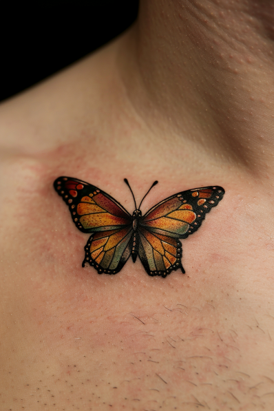 This beautiful chest tattoo features a vibrant butterfly with warm hues of orange, yellow, and red, blending seamlessly with darker accents on the tips of the wings. The gradient effect on the wings gives the butterfly a lifelike appearance, almost as if it s ready to take flight. The delicate black outlines and fine details bring the entire piece together, creating a tattoo that is both bold and elegant. Its placement on the chest makes it a striking focal point, giving the design a sense of personal significance and beauty.