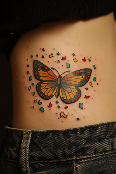 This fun and vibrant tattoo showcases a bright monarch butterfly surrounded by colorful confetti-like shapes. The butterfly s orange and black wings are bold and striking, while the surrounding confetti in reds, blues, yellows, and purples gives the design a playful, celebratory feel. The tattoo s clean lines and bright pops of color make it stand out, giving off a cheerful and lively vibe. Placed on the side of the torso, this piece adds a splash of color in a subtle yet exciting spot.