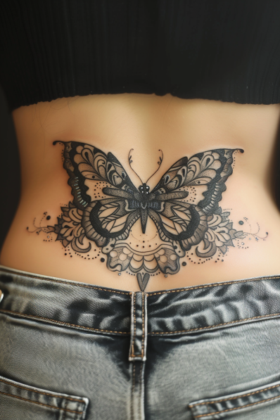 This striking lower back tattoo features a large, intricate butterfly design with ornate, mandala-like details. The wings are filled with lace-like patterns, blending fine line work and shading to create an almost filigree effect. Beneath the butterfly, symmetrical floral designs and dot work extend the elegance, framing the butterfly beautifully. This placement on the lower back enhances the design s flow, making it a perfect piece that highlights the curves of the body.