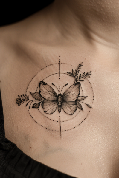 This gorgeous collarbone tattoo features a delicate butterfly surrounded by subtle geometric shapes and botanical elements. The butterfly itself is rendered in soft black and grey shading, with its wings slightly open, giving it a sense of calm and stillness. The dotted lines and circular patterns around the butterfly add a modern, geometric twist, while the small floral details bring a touch of nature to the design. The placement along the collarbone highlights the contours of the body, making it a visually stunning piece that s both artistic and feminine.