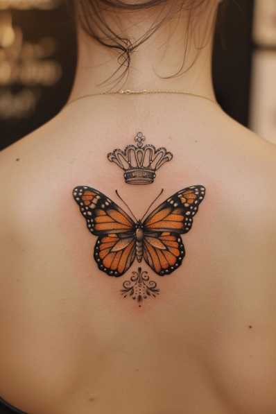 I love the balance in this tattoo there s something so powerful about the combination of a butterfly, which symbolizes transformation and freedom, and the crown, representing strength and leadership. It s like a beautiful reminder that growth and personal transformation can lead to empowerment. The placement on the upper back is perfect for this kind of design, making it a bold yet graceful statement. If you re someone who values both beauty and strength, this tattoo blends those two elements seamlessly!