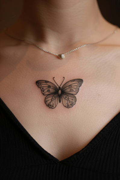 I love how simple and refined this tattoo is! It s the kind of piece that doesn t scream for attention but still makes a statement with its clean lines and soft presence. Chest tattoos can sometimes be overwhelming, but this one is so perfectly balanced it s feminine without being too much. The minimal details allow the butterfly s natural beauty to shine, making it a great choice if you want something timeless that will never go out of style. Plus, who wouldn t want a little reminder of transformation and growth right next to their heart?