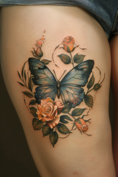 This stunning thigh tattoo features a large, elegant blue butterfly surrounded by soft, peach-colored roses and lush green leaves. The butterfly s wings are beautifully shaded, transitioning from a deep blue to lighter tones, giving it a sense of depth and movement. The roses, with their delicate petals and subtle highlights, create a perfect balance between nature s beauty and the boldness of the butterfly. The placement on the thigh allows the design to stand out, making it both a bold and feminine choice.