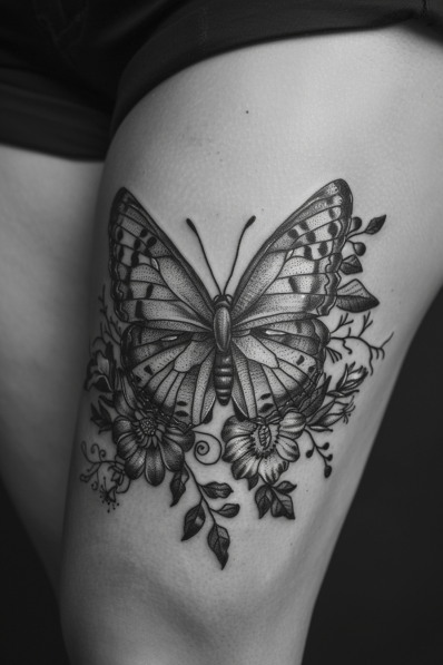 I gotta say, I absolutely love this one! It s a perfect mix of nature and art. The floral design elevates the butterfly from just a simple insect to a full-on masterpiece. Plus, thigh tattoos are a great canvas for larger pieces like this, so it can really shine. It s bold without being too aggressive, and the mix of soft shading and sharp details really makes it pop. Honestly, if you re going for a tattoo that feels both powerful and elegant, this is it!