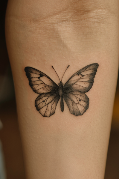 This butterfly tattoo showcases a stunningly realistic design, with incredible attention to shading and detail. The wings feature intricate line work, creating a soft gradient from dark to light as they reach the edges. The subtle texture and the precise dots along the wings give it a lifelike, delicate feel. Placed on the forearm, it s perfectly framed for visibility, making it a great piece that can be admired from any angle.