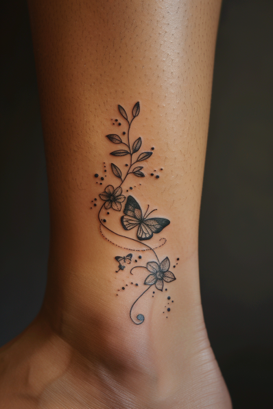 This elegant ankle tattoo features a butterfly surrounded by a winding vine, accented with small flowers and leaves. The flowing vine guides the eye through the design, while the butterfly appears to be gently perched among the foliage. The soft line work and delicate dots give the tattoo a sense of lightness and movement, making it feel like a natural extension of the body. The placement on the ankle enhances the graceful curves of the design, making it a perfect, subtle statement piece.