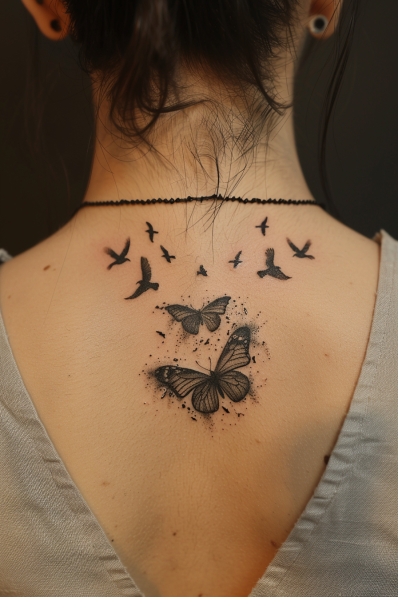 What I really love about this tattoo is how it embodies such a powerful metaphor for growth and freedom. The gradual transition from the butterfly to the birds feels like a journey, a transformation that reflects personal evolution. It s subtle but carries so much meaning, and the placement on the upper back makes it feel like it s lifting off the skin. It s a design that speaks volumes without needing to be overly complicated, making it perfect for someone who values both symbolism and simplicity.