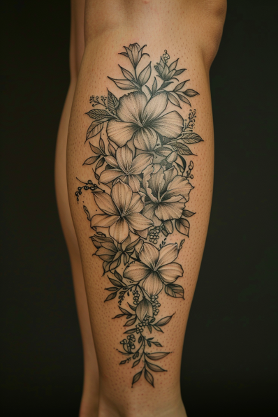 This floral vine tattoo cascades beautifully down the calf, featuring a stunning arrangement of large, intricately detailed flowers intertwined with delicate leaves and buds. The tattoo is done in black and gray, giving it a classic and timeless look, while the fine linework adds a touch of elegance and refinement. The flowers are densely packed, creating a lush and full appearance that draws the eye along the natural curve of the leg. The placement on the calf allows the design to stretch vertically, enhancing the sense of flow and movement in the tattoo.