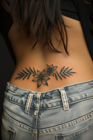 This tropical-themed palm leaf vine tattoo spreads elegantly across the lower back, blending the lush beauty of palm leaves with delicate floral accents. The design is centered around bold, dark leaves that fan out symmetrically, creating a striking visual effect. The flowers nestled between the leaves add a soft contrast, making the whole piece feel balanced and harmonious. The shading gives the tattoo a subtle depth, while the placement on the lower back ensures it s both eye-catching and perfectly positioned.