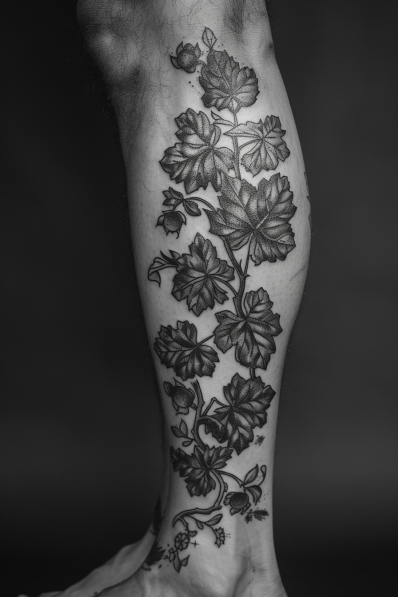 This oak leaf vine tattoo is a bold and intricate piece that climbs up the calf, showcasing the strength and resilience of the oak tree through its leaves. The tattoo features large, detailed oak leaves, each one meticulously shaded in a rich black and grey style that brings out the natural texture and depth of the leaves. The vine weaves its way up the leg, creating a strong visual impact while perfectly complementing the contours of the calf. The monochromatic palette adds a classic, timeless feel to the design, making it both powerful and elegant.