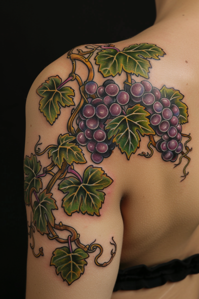 Now, this tattoo is a total feast for the eyes literally! The realistic style is incredibly well done, making the grapes look like you could almost pluck them right off the skin. It s not just a tattoo; it s a piece of art that really makes a statement. I love how it combines the natural beauty of the vine with a bold, colorful palette, making it both elegant and striking. If you re someone who wants a tattoo that s bursting with life and energy, this grape vine design is definitely the way to go. Plus, it s a great conversation starter who wouldn t be intrigued by a bunch of juicy grapes on your shoulder?
