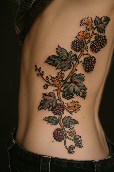 This tattoo is a vibrant depiction of a blackberry vine, sprawling elegantly across the side of the body. The design features luscious blackberries in various stages of ripening, surrounded by large, detailed leaves that change color from deep green to autumnal shades of orange and yellow. The vine itself winds organically along the natural curves, creating a dynamic and visually striking piece that feels like it could be plucked straight from a woodland scene.