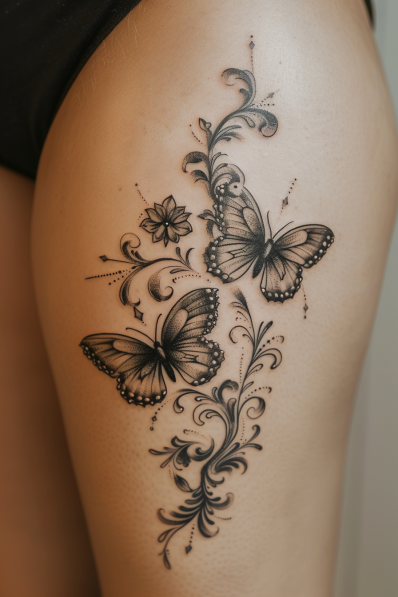 I have to say, this tattoo is absolutely charming. The butterflies add a whimsical touch, symbolizing transformation and freedom, while the vine brings in an element of natural elegance. It s the perfect mix of playful and sophisticated, making it a versatile design that could fit any occasion. I m really into how the whole piece flows so naturally with the body s curves it s like the butterflies are actually dancing on the skin. If you re looking for a tattoo that s feminine, graceful, and full of life, this butterfly vine design is a fantastic choice.