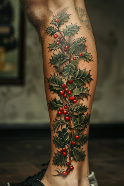 This striking holly vine tattoo wraps beautifully around the calf, showcasing vibrant green leaves and bright red berries. The tattoo features realistic shading that adds depth and texture, making the holly leaves look almost three-dimensional. The red berries pop against the dark green, creating a vivid contrast that draws the eye. The vine s natural flow along the calf s contour gives the design a dynamic and organic feel.