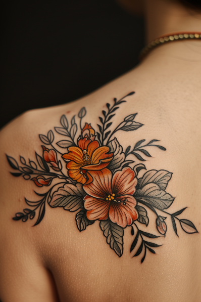 This hibiscus vine tattoo is a beautiful fusion of Japanese ukiyo-e style and vibrant floral design, gracefully adorning the shoulder. The tattoo features stunning hibiscus flowers in rich shades of orange, perfectly complemented by deep green leaves and swirling vines that extend outward. The ukiyo-e influence is clear in the bold outlines and the stylized, flowing forms that give the design a timeless and artistic flair. The placement on the shoulder enhances the natural movement of the piece, making it look like the flowers are gently resting on the skin.