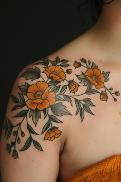This neo-traditional marigold vine tattoo spreads beautifully across the chest and shoulder. With vibrant orange flowers and rich green leaves, the design flows naturally along the body s curves. The bold outlines and subtle shading give the tattoo depth and ensure it stands out.