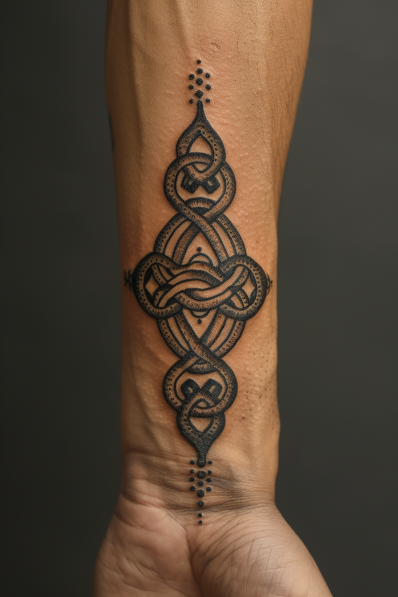 This Celtic knotwork vine tattoo is a striking piece that takes the traditional vine design and gives it a bold, intricate twist. The tattoo features a complex arrangement of interwoven knots that form a symmetrical, vine-like pattern running down the forearm. The black ink contrasts sharply with the skin, making the detailed knotwork stand out beautifully. Small dotwork accents at the top and bottom of the design add a touch of elegance and precision, completing the piece with a sense of balance and harmony.