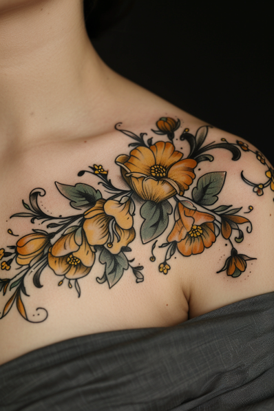 Neo Traditional Marigold Vine Tattoo on Chest and Shoulder