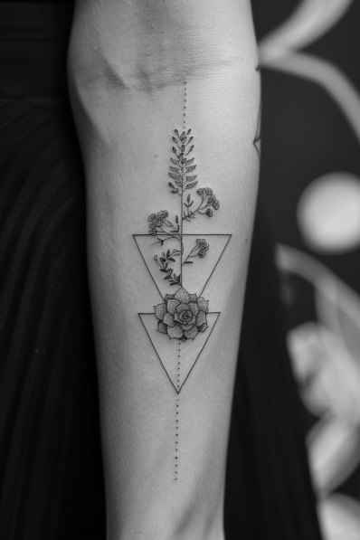 I ve got to say, this tattoo is a fantastic blend of styles. The succulents bring in that earthy, enduring vibe, while the geometric elements give it a contemporary edge. The design feels balanced and thoughtful, with each element complementing the other perfectly. If you re into tattoos that offer both visual interest and deeper meaning, this geometric-style vine with succulents is a standout choice. It s the kind of tattoo that s not only beautiful but also makes a statement about the harmony between nature and modern design.