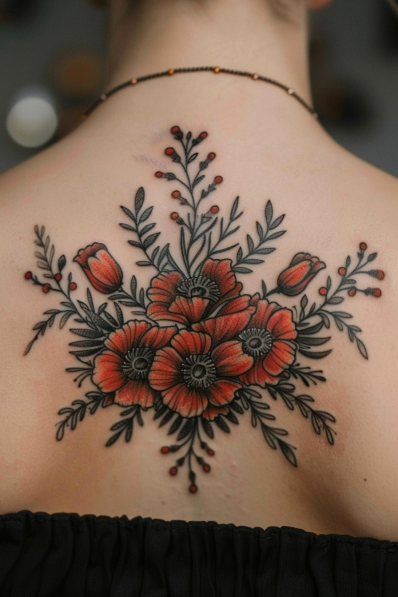 I ve got to say, this tattoo is nothing short of stunning. Poppies are often associated with remembrance and peace, but they also symbolize beauty and strength, making this design both meaningful and visually captivating. The placement on the upper back allows the tattoo to be both prominent and elegant, creating a beautiful centerpiece that s bound to draw admiration. The contrast between the vibrant reds and the darker details adds depth and dimension, making the flowers almost seem alive. If you re looking for a tattoo that s as bold as it is beautiful, this poppy vine design is definitely a showstopper. It s got that perfect mix of intensity and grace that makes it truly unforgettable!