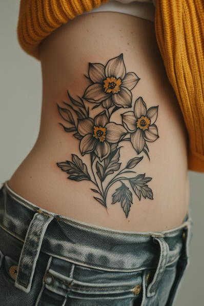 I ve got to say, this tattoo is a real standout. Daffodils are often associated with new beginnings and hope, making this design not just beautiful but also deeply meaningful. The way the vine winds through the flowers adds a sense of movement and life to the piece, while the placement on the ribs gives it a certain elegance and grace. It s the kind of tattoo that s subtle enough to keep personal but impressive enough to make you want to show it off. If you re looking for something that s both timeless and full of symbolic meaning, this vine with daffodils tattoo is definitely a winner. It s got that perfect mix of beauty and significance that makes it truly special.
