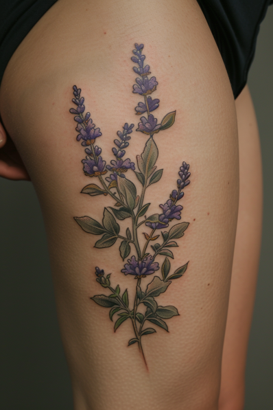 I ve got to say, this tattoo is just lovely. Lavender is known for its calming and soothing properties, and having it as a tattoo feels like carrying a little piece of tranquility with you wherever you go. The design is both simple and sophisticated, making it perfect for someone who appreciates understated beauty. Plus, the placement on the thigh is spot-on it s a great spot for a design that s meant to be both seen and cherished. If you re into tattoos that are as meaningful as they are beautiful, this lavender vine tattoo is a fantastic choice. It s got that perfect blend of elegance and subtle charm that s hard to resist!
