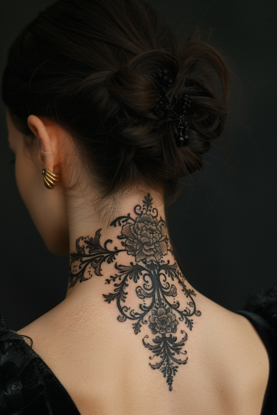 This Gothic vine neck tattoo is a dark and intricately detailed masterpiece that exudes elegance and mystery. The design features ornate vines intertwined with blooming flowers, creating a symmetrical pattern that drapes gracefully across the back of the neck. The black ink work is meticulously detailed, with delicate lines and subtle shading that bring out the depth and texture of the design. The placement on the neck enhances the Gothic aesthetic, making it a bold yet sophisticated statement piece.
