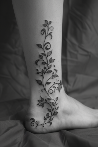 This ankle tattoo showcases a beautifully intricate vine design, winding gracefully up from the foot towards the calf. The tattoo features delicate leaves and subtle curls that give it a sense of flow and movement, almost as if the vine is naturally growing up the leg. The design is entirely in black ink, with a fine line style that keeps it understated yet visually captivating.