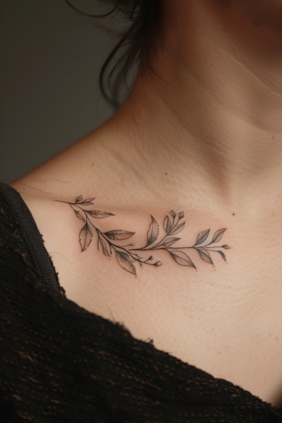 I really love this tattoo s simplicity and grace. It s one of those designs that can say a lot without being too loud, which I think is the beauty of minimalist tattoos. The olive vine, with its symbolism of peace and resilience, adds a meaningful layer to the design. Plus, the placement along the collarbone is just spot-on it s like the tattoo is perfectly framed by the natural lines of the body. If you re looking for a tattoo that s understated yet deeply personal, this olive vine design is definitely worth considering. It s subtle, chic, and carries a beautiful message.