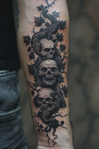 Now, let s be real this tattoo is not for the faint-hearted, and that s exactly what makes it so cool. The combination of the skulls with the Gothic vine creates a powerful statement piece that screams strength, mystery, and a touch of rebellion. I love how the design plays with light and shadow, making it feel almost alive. If you re into tattoos that have a darker, more intense vibe, this one definitely hits the mark. It s a bold, badass choice that s sure to turn heads and start conversations just the way a great tattoo should!