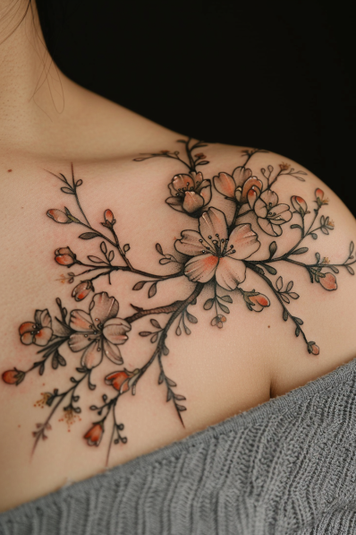 I have to say, this tattoo is truly enchanting. Cherry blossoms are often associated with the fleeting beauty of life and the arrival of spring, making this design not just beautiful but also rich in symbolism. The way the vine curves and spreads across the shoulder adds a touch of elegance and grace, making it a perfect choice for anyone who loves nature-inspired tattoos. Plus, the soft colors and delicate lines give it a romantic, feminine feel that s just hard to resist. If you re looking for a tattoo that s both stunning and meaningful, this cherry blossom vine is definitely a standout choice!