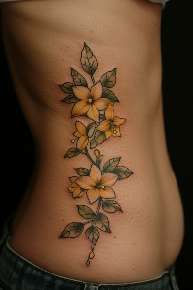 This watercolor jasmine vine tattoo gracefully cascades down the side of the ribcage, featuring soft yellow jasmine flowers blooming along a delicate vine. The watercolor technique gives the flowers a dreamy, ethereal quality, with subtle gradients and shading that make the petals appear almost translucent. The green leaves add a vibrant contrast, enhancing the natural beauty of the design. The placement along the ribs complements the body s curves, making this tattoo a perfect blend of elegance and sensuality.