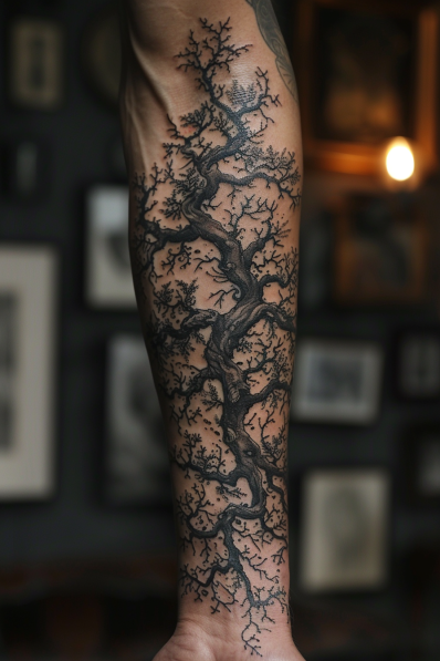 This twisting vine tattoo in a blackwork style is nothing short of captivating. The intricate branches seem to curl and weave around the forearm like a living, breathing piece of art. The depth and detail in the shading bring the design to life, making the vine look almost like it s growing right under the skin. The way it spirals and stretches, covering the length of the arm, gives it an organic, natural flow that s both striking and elegant.