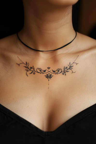 This delicate vine tattoo gracefully adorns the collarbone, featuring two small birds perched on either side of a slender vine. The design is minimalistic yet beautifully detailed, with the birds and leaves rendered in fine linework that adds a touch of elegance and subtlety. The vine curves gently across the collarbone, creating a natural flow that perfectly complements the body s contours. The small dotwork accents at the center and ends add a hint of symmetry, tying the whole design together in a balanced and harmonious way.