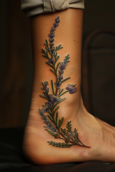 This enchanting tattoo wraps elegantly around the ankle, featuring a delicate vine adorned with lavender and rosemary. The design captures the essence of these two aromatic herbs, with their slender leaves and soft purple flowers beautifully rendered in a realistic style. The vine s flow naturally follows the curve of the foot, creating a harmonious and organic look that feels as though it s part of the body.