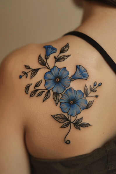 Now, this tattoo is definitely one to admire. The morning glory flowers, with their vibrant blue color, are not just visually stunning but also carry a deeper meaning of renewal and the beauty of the morning. I m really into how the neo-traditional style gives the design a modern edge while keeping that timeless, almost classic tattoo vibe. Plus, the way it sits on the shoulder makes it perfect for showing off whether you re wearing a tank top or just want a pop of color peeking out from under your clothes. If you re after a tattoo that s bold, beautiful, and full of meaning, this morning glory vine is a perfect choice. It s got that wow factor without trying too hard, which is always a win in my book!