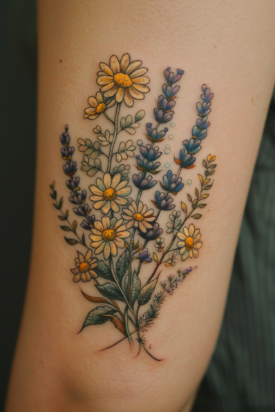 I m loving the combination of lavender and chamomile in this tattoo. It feels fresh, soothing, and connected to nature perfect for someone who values tranquility and beauty. The botanical style is always a winner, with its focus on fine detail and natural elements. Plus, the way this tattoo uses color is just gorgeous; it s vibrant without being overwhelming. If you re into tattoos that are both stylish and meaningful, this one definitely ticks all the boxes!