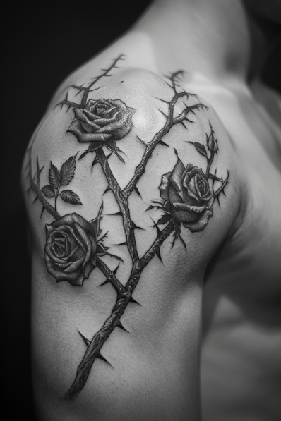 Now, this tattoo is seriously impressive. It perfectly captures the duality of beauty and pain, with the delicate roses juxtaposed against the harsh thorns. The shoulder placement is ideal, giving the design room to stretch and making it a bold, eye-catching piece. I love how the tattoo combines elegance with a bit of grit it s like wearing your strength and passion right on your skin. If you re looking for a tattoo that s as meaningful as it is visually stunning, this vine with roses and thorns design is definitely a top contender. It s got that perfect balance of artistry and symbolism that makes it truly unforgettable.