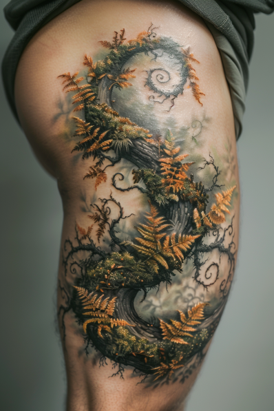 This vine with ferns and moss tattoo wraps around the thigh, creating a mesmerizing forest-themed masterpiece. The design is incredibly detailed, featuring a twisted vine that spirals upward, intertwined with lush ferns and patches of moss. The vibrant oranges and greens of the ferns contrast beautifully with the dark, textured vine, creating a realistic and almost three-dimensional effect. The tattoo captures the essence of an ancient, enchanted forest, with the moss adding a touch of earthy texture that brings the whole piece to life.