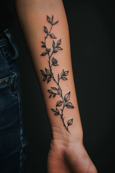 This minimalist vine tattoo gracefully wraps along the forearm, featuring delicate leaves sprouting from a single, slender vine. The design s simplicity is its strength, with clean lines and a straightforward structure that creates a natural flow down the arm. The leaves vary in size, adding a touch of realism without overwhelming the minimalistic vibe. It s a tattoo that feels both elegant and understated, perfect for someone who appreciates subtle beauty.
