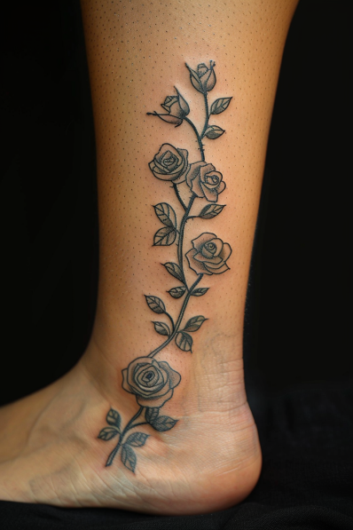 This fine line rose vine tattoo elegantly wraps around the ankle, featuring a delicate string of roses blooming along a slender vine. The design is subtle yet striking, with each rosebud carefully detailed in a clean, precise linework that adds to its understated beauty. The vine gently curves, following the natural contours of the ankle and foot, making it a perfect piece for someone who loves the idea of wearing a bit of nature wherever they go.
